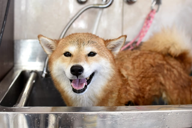 専用の大きなバスタブで犬を洗います。